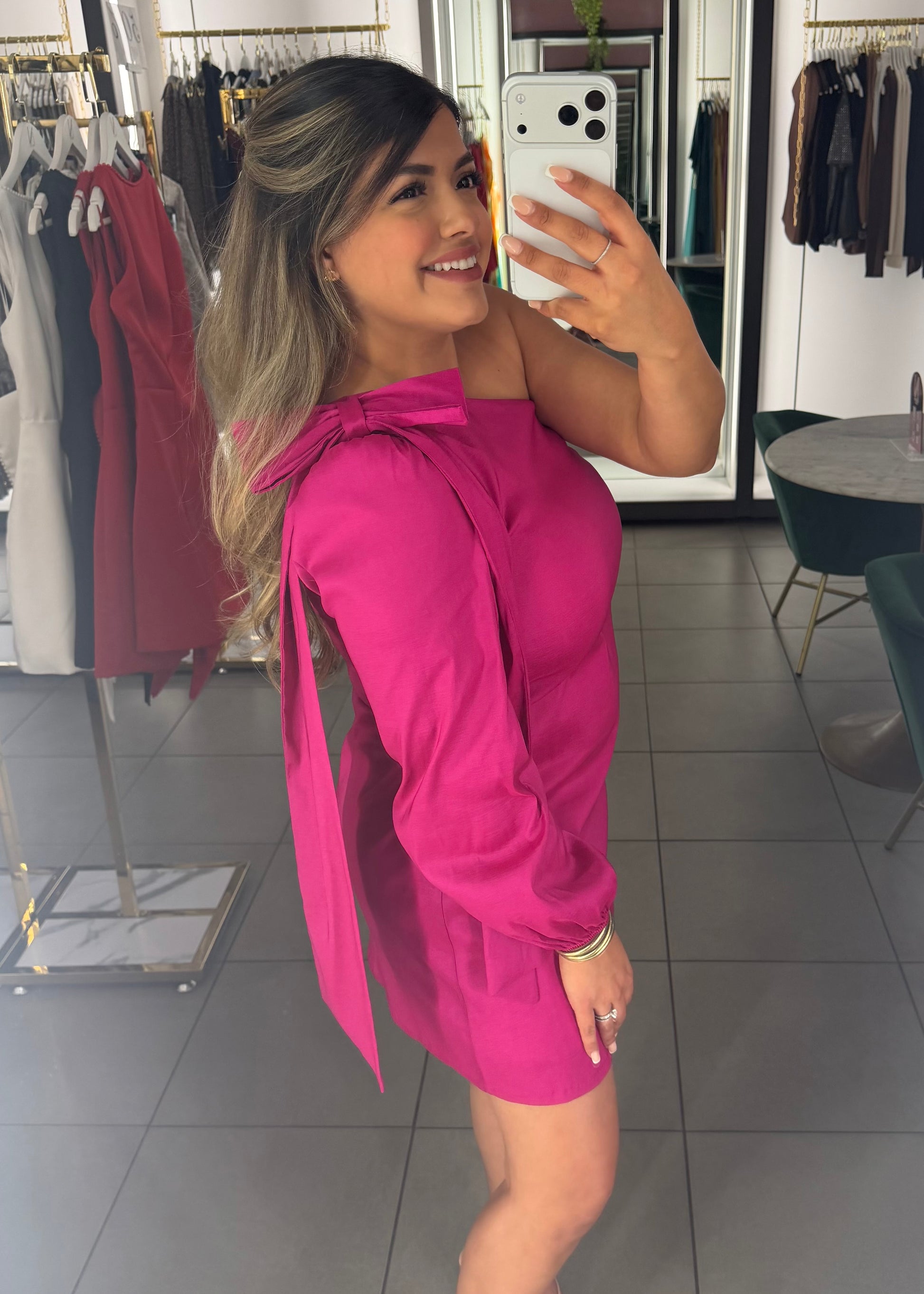 A bold and feminine mini dress featuring a dramatic one-shoulder bow, smooth structured fabric, and a flattering silhouette. Perfect for holiday parties, birthdays, and any night you want to stand out.