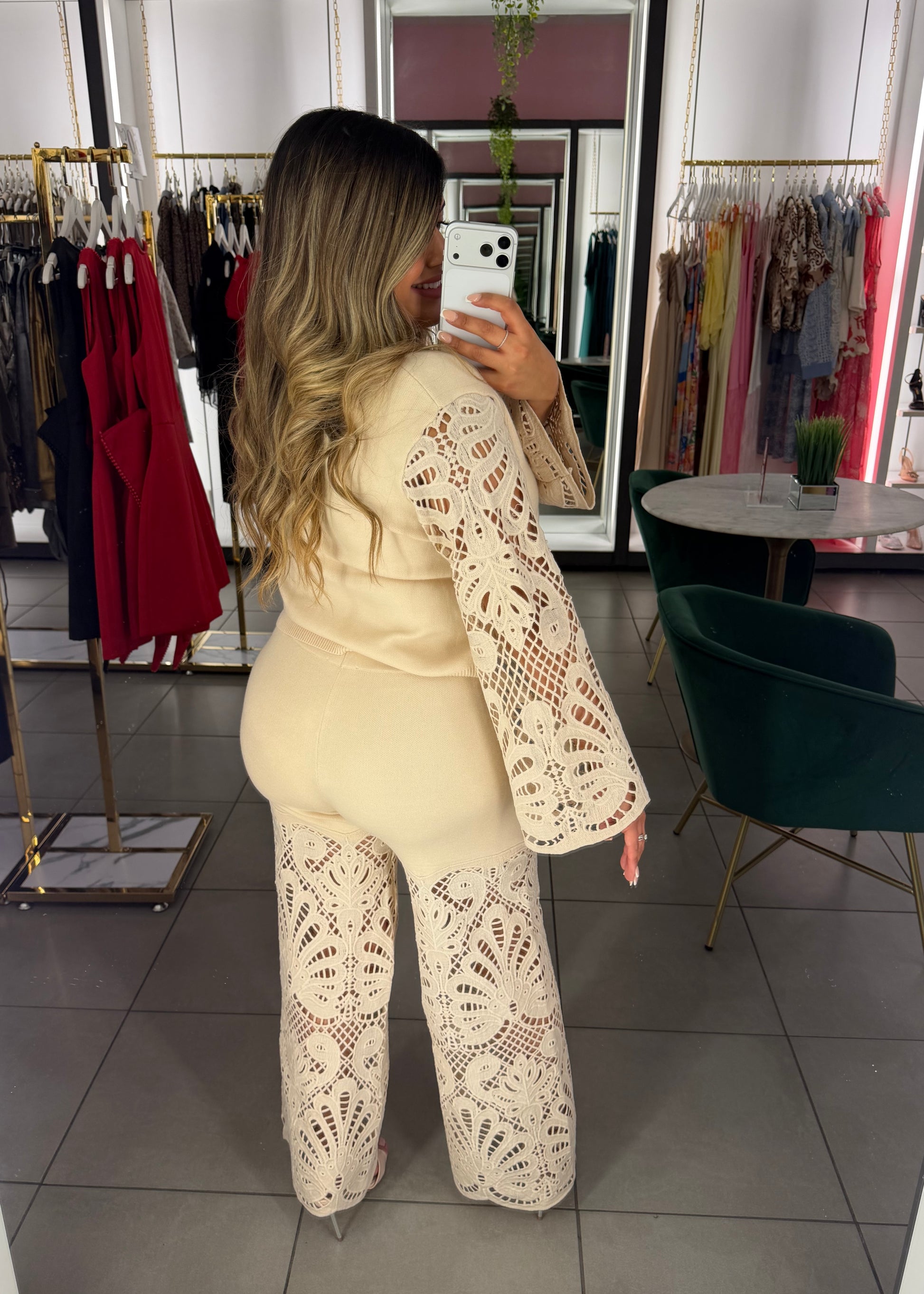 A chic two-piece knit set featuring dramatic crochet sleeves and pant panels. Soft, stretchy, and perfect for a stylish day or vacation look.
