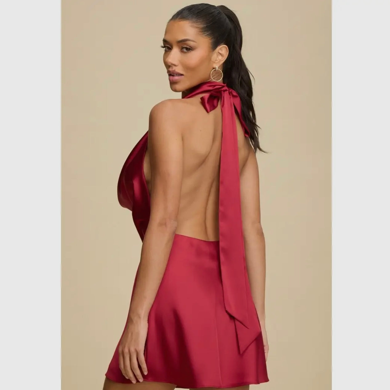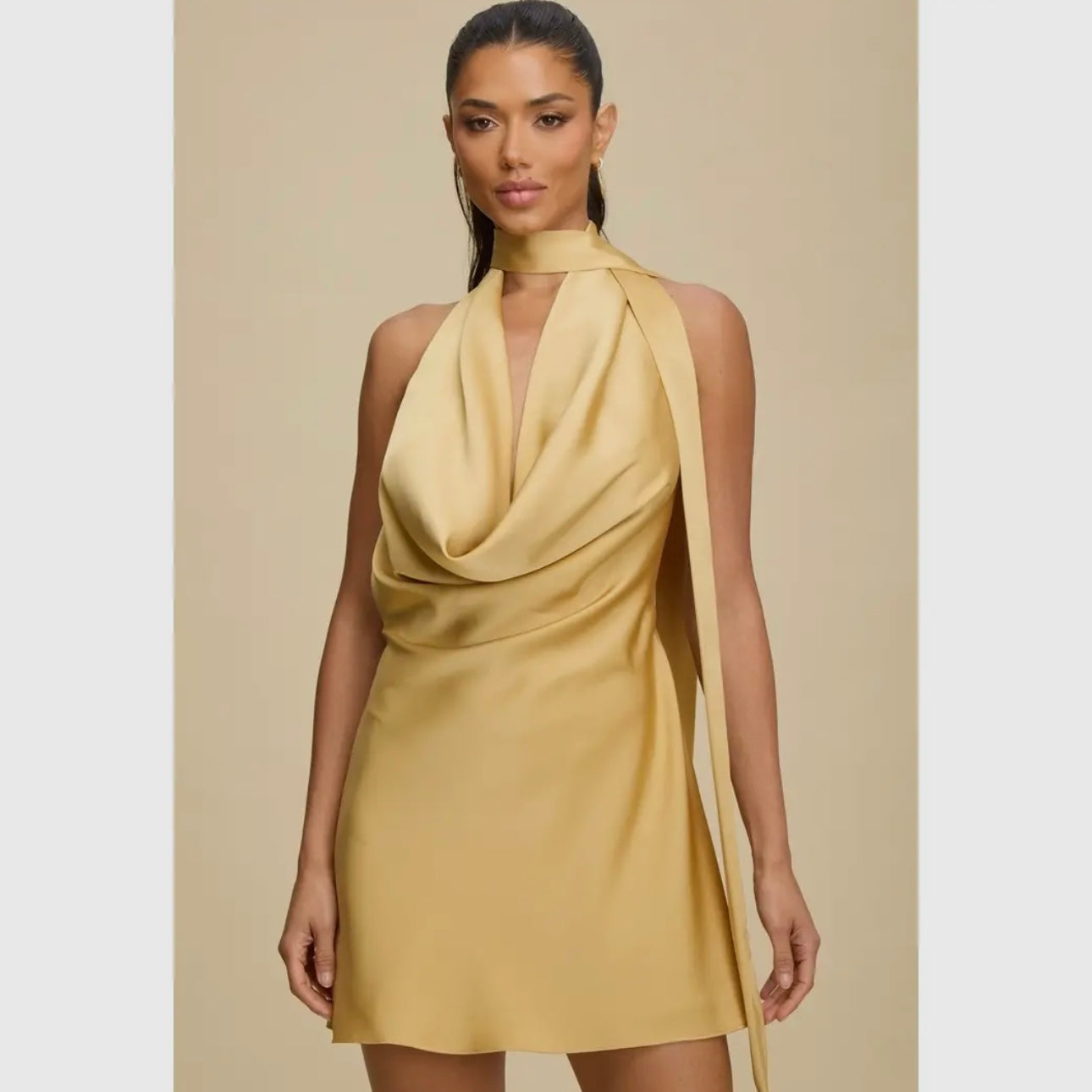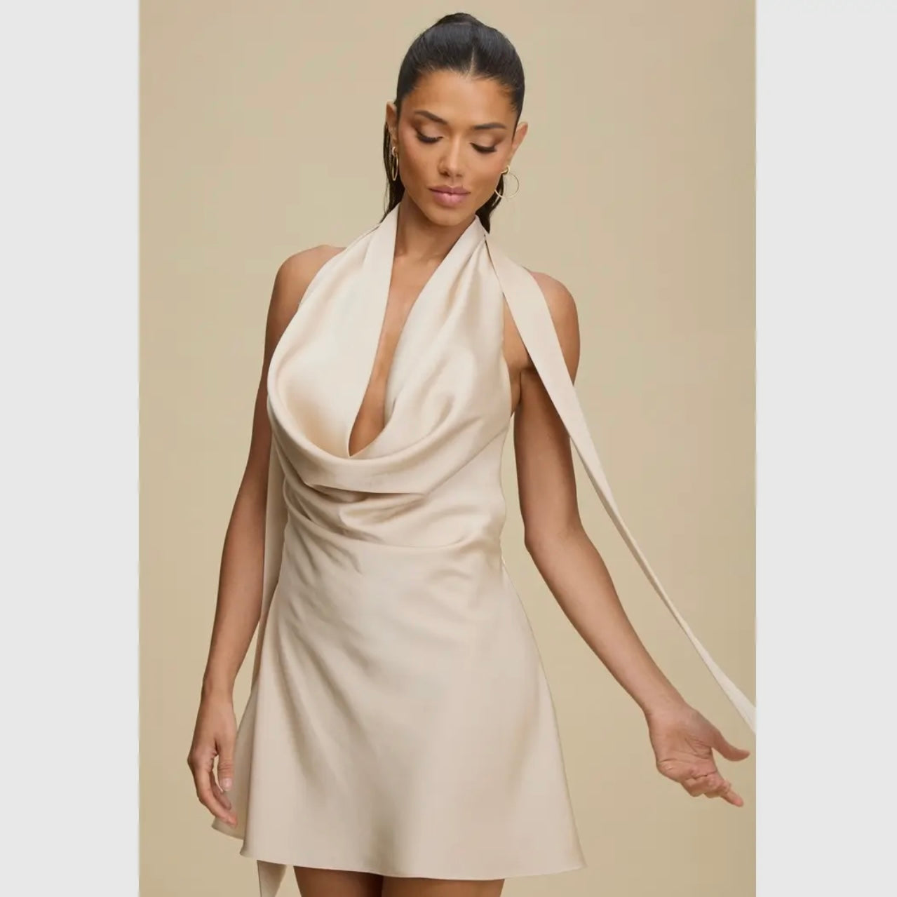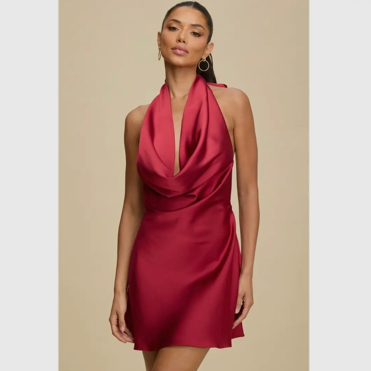 Turn heads in our Satin Halter Mini Dress, designed with a sultry draped cowl neckline and an open back that ties elegantly at the neck. The silky satin fabric gives it a luxe shine, while the flared mini hemline adds a playful, flirty touch. Perfect for date nights, cocktail parties, or special occasions where you want to stand out.