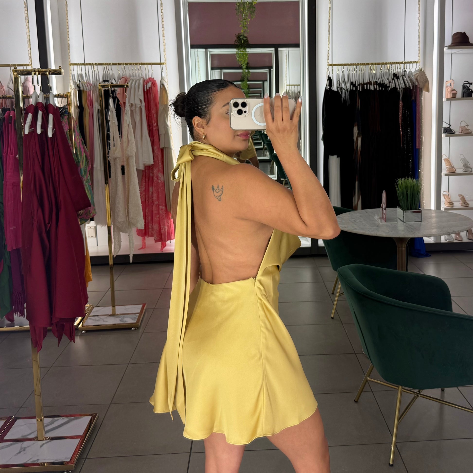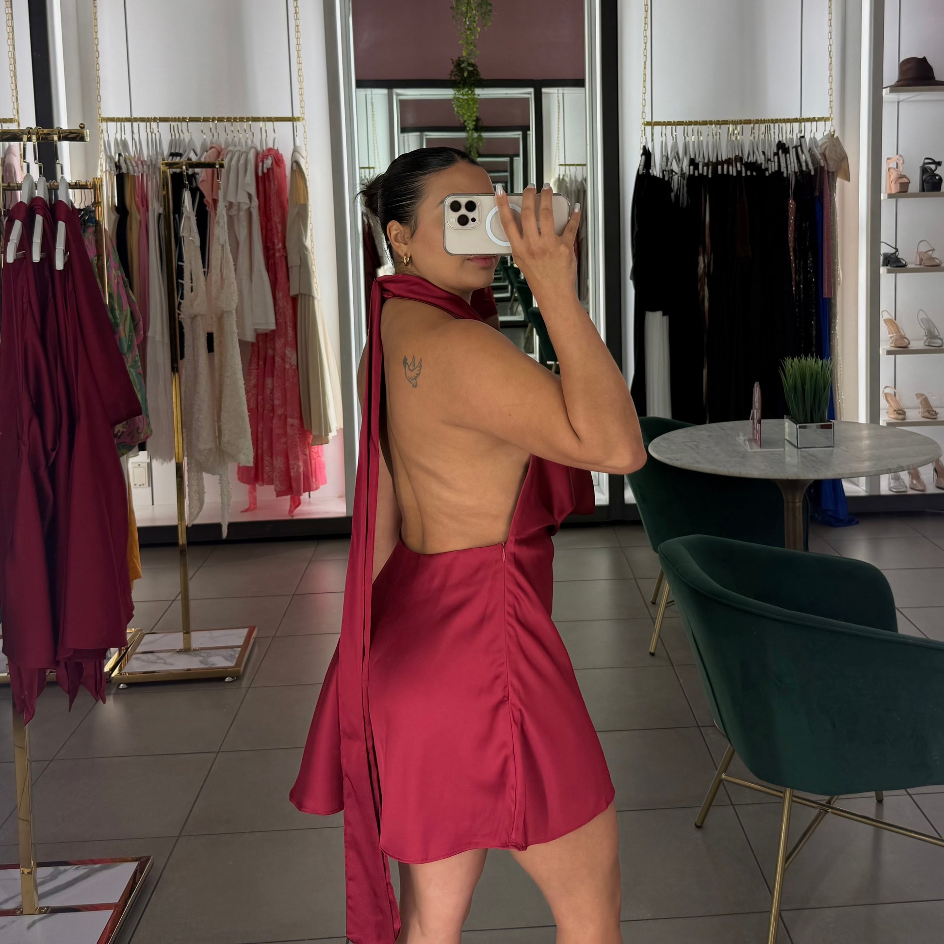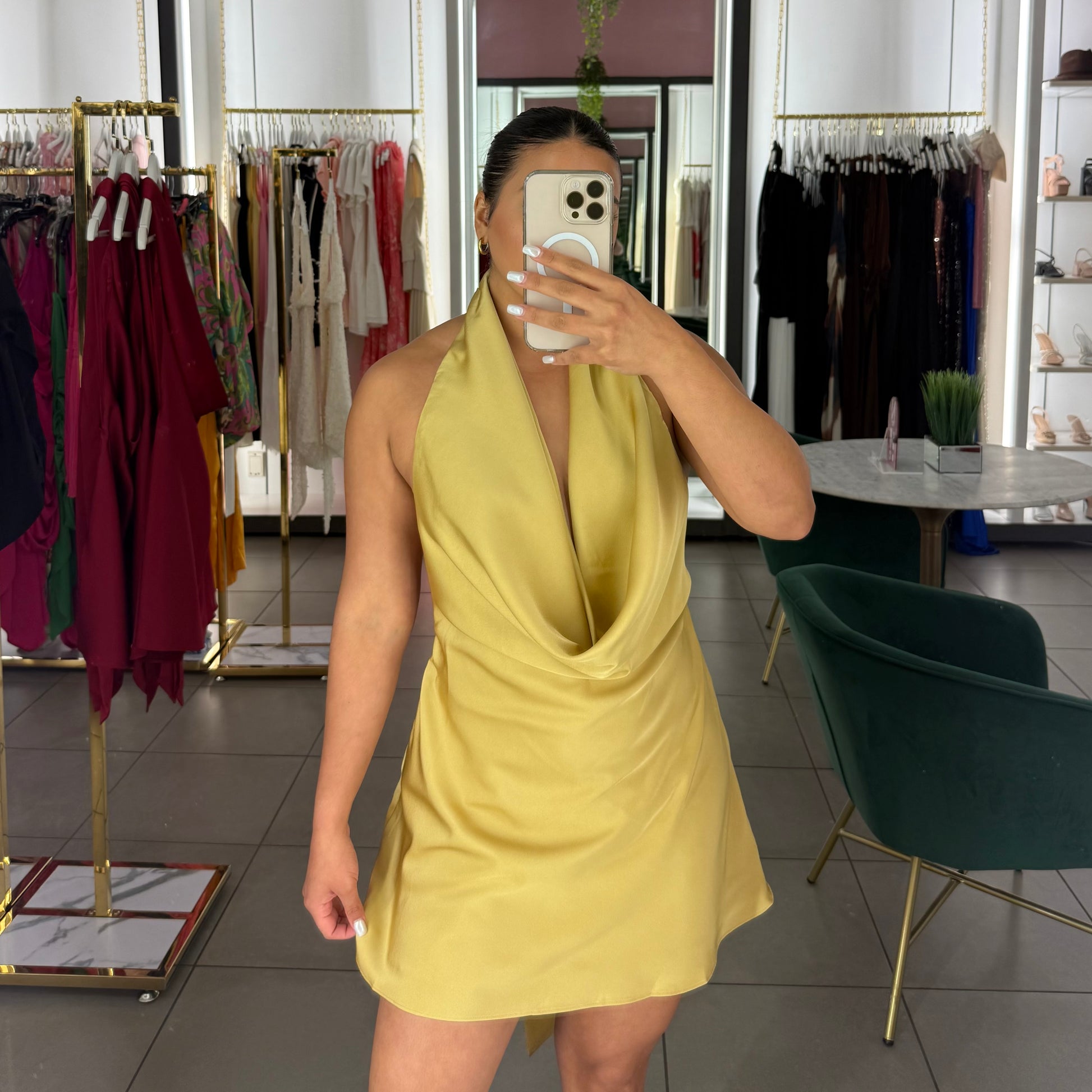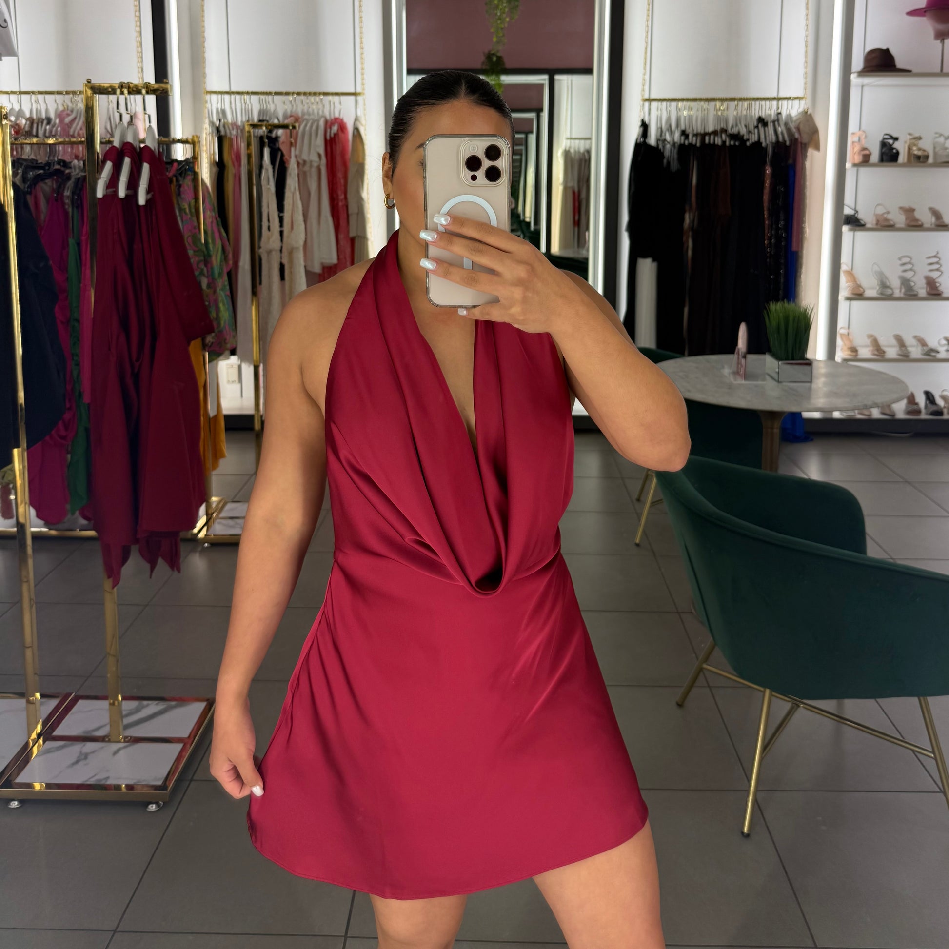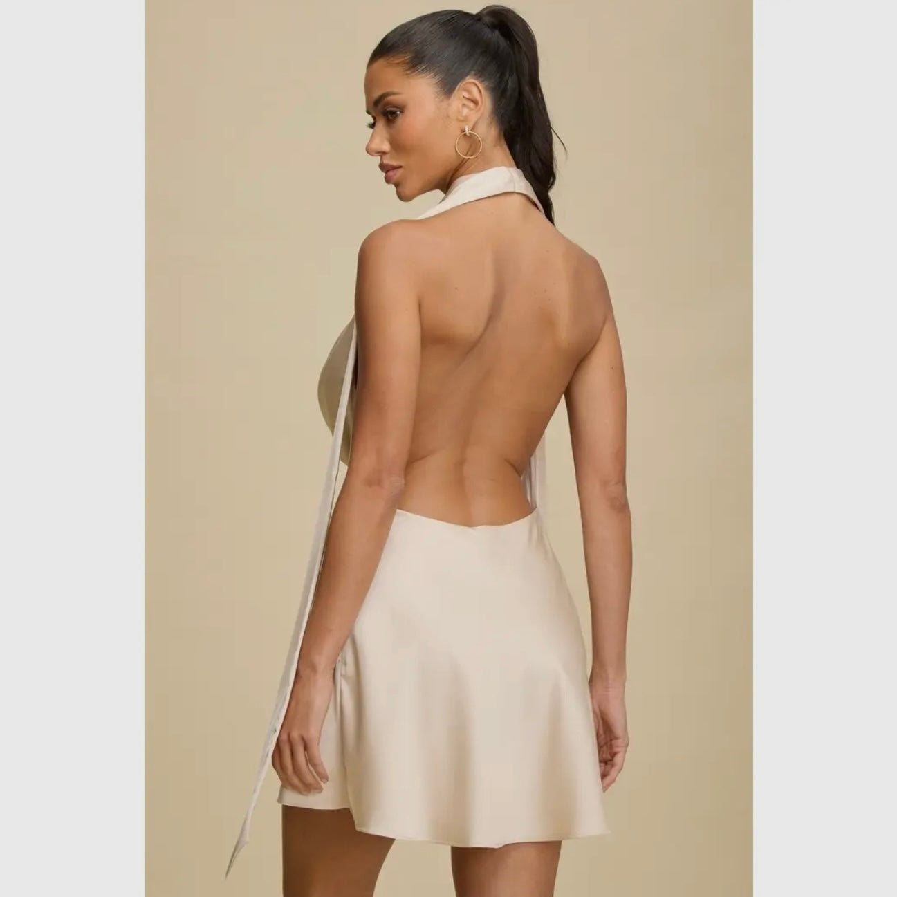 Turn heads in our Satin Halter Mini Dress, designed with a sultry draped cowl neckline and an open back that ties elegantly at the neck. The silky satin fabric gives it a luxe shine, while the flared mini hemline adds a playful, flirty touch. Perfect for date nights, cocktail parties, or special occasions where you want to stand out.