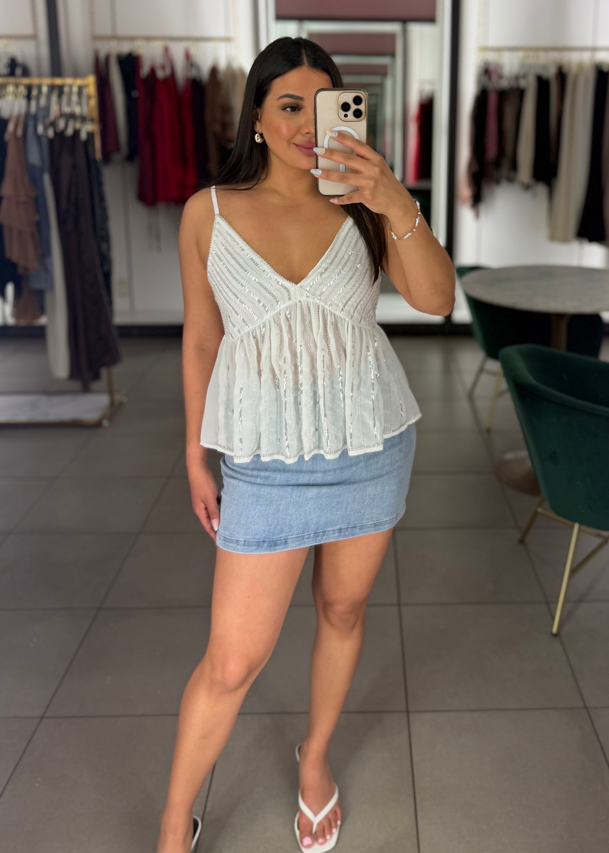 Flowy, flirty, and just the right amount of sparkle. This babydoll cami features vertical sequin stripes, a V-neckline, adjustable straps and a peplum hem that pairs perfectly with everything from denim minis. Available in Blush, White & Baby Blue.