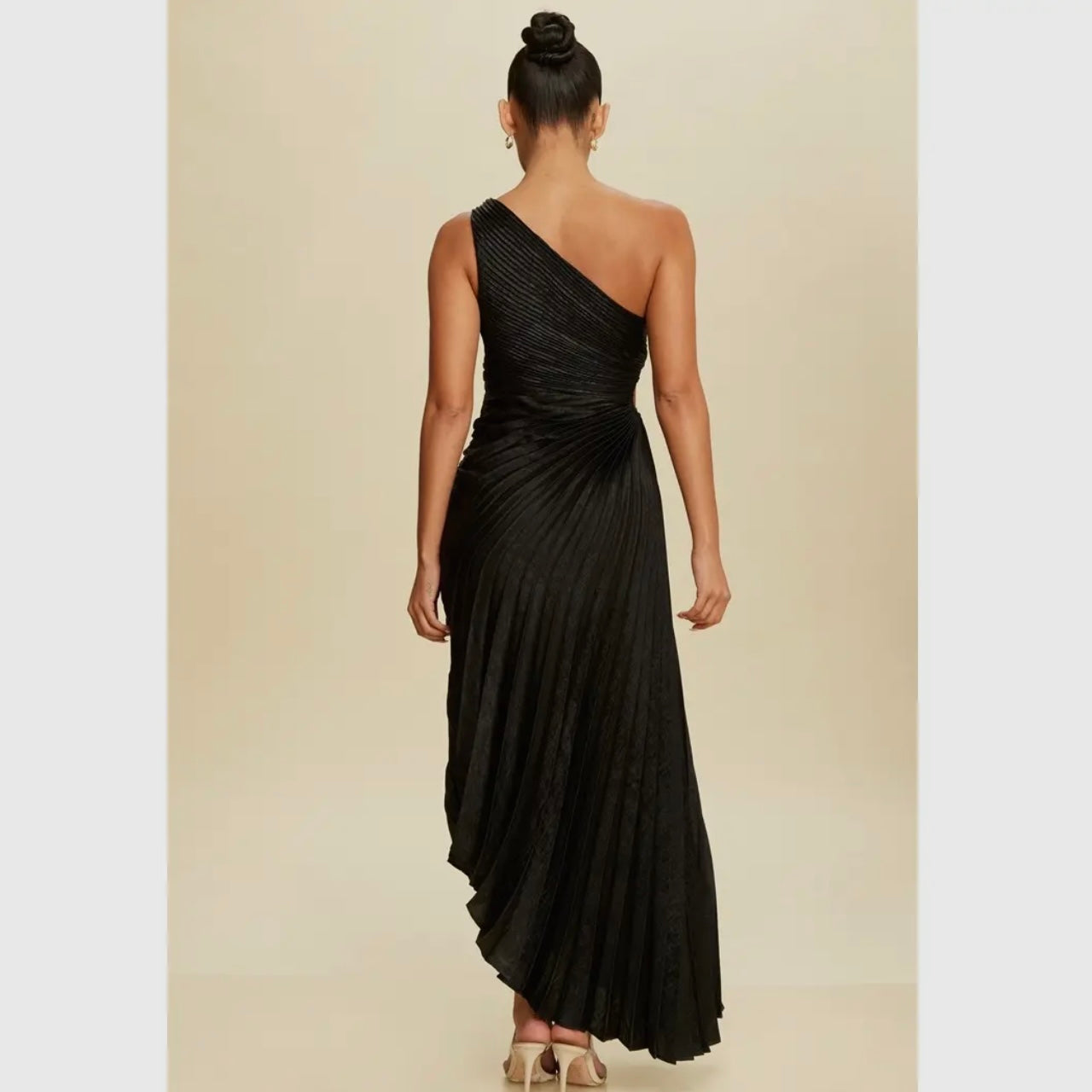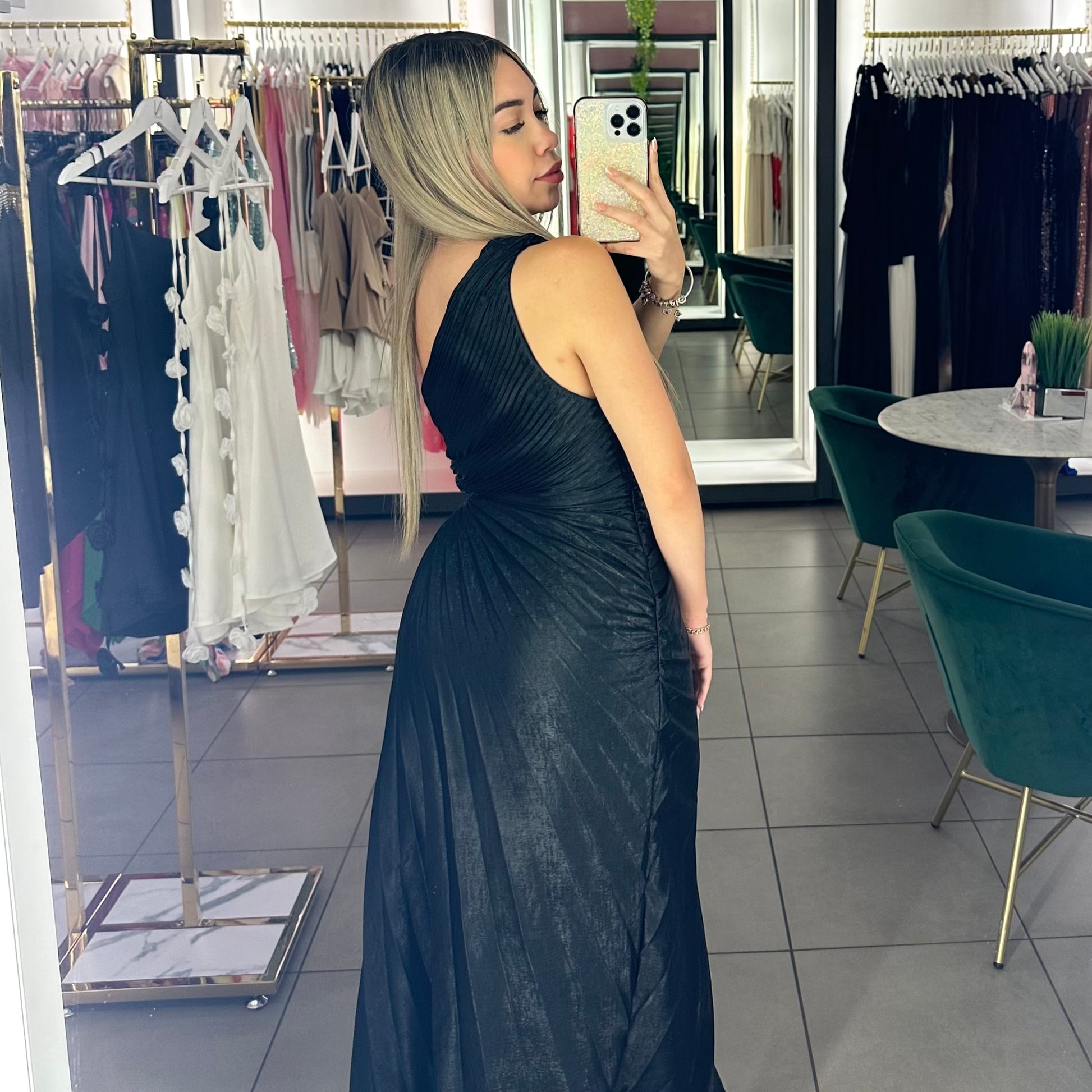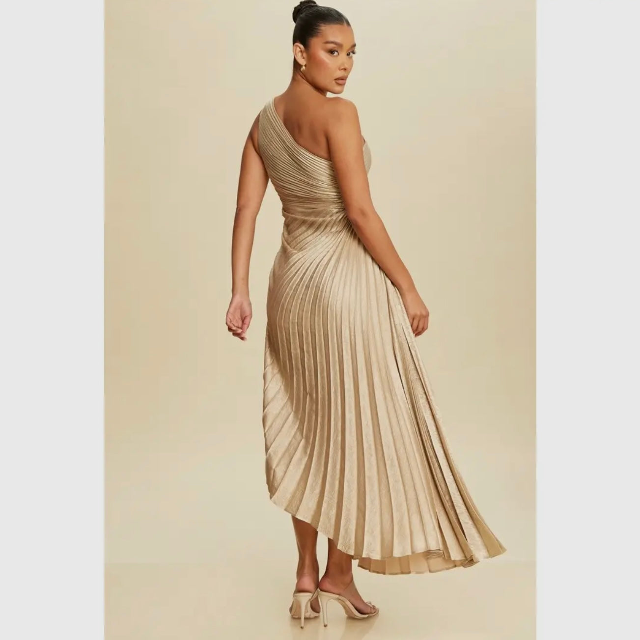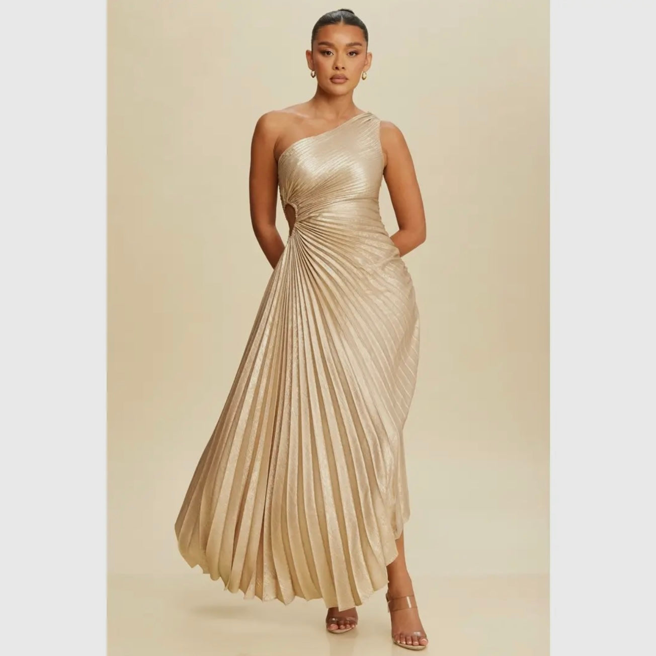 Turn heads in this elegant one-shoulder gown featuring shimmering metallic fabric and sculpted pleats that flatter the waist and flow beautifully. Perfect for weddings, galas, and special occasions.