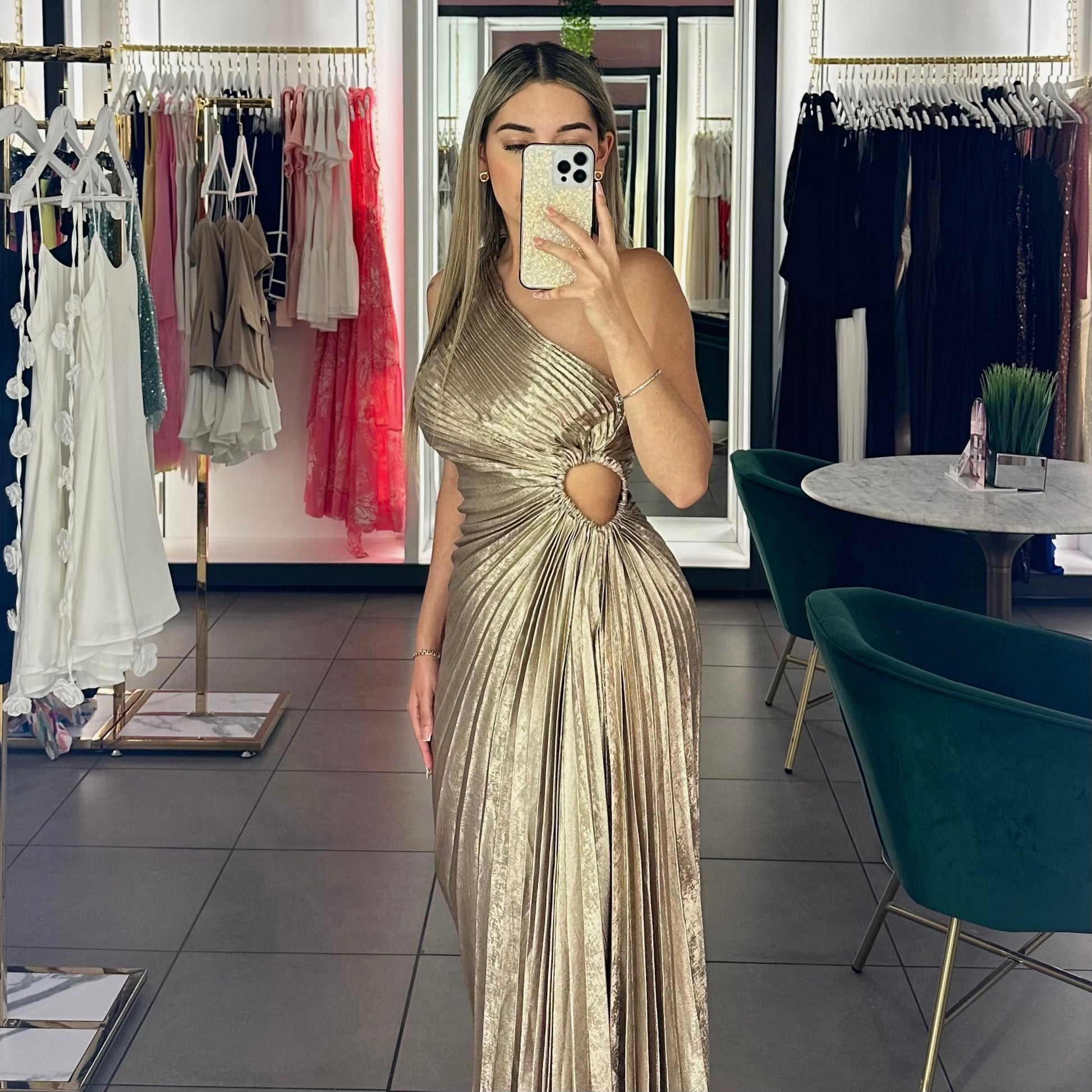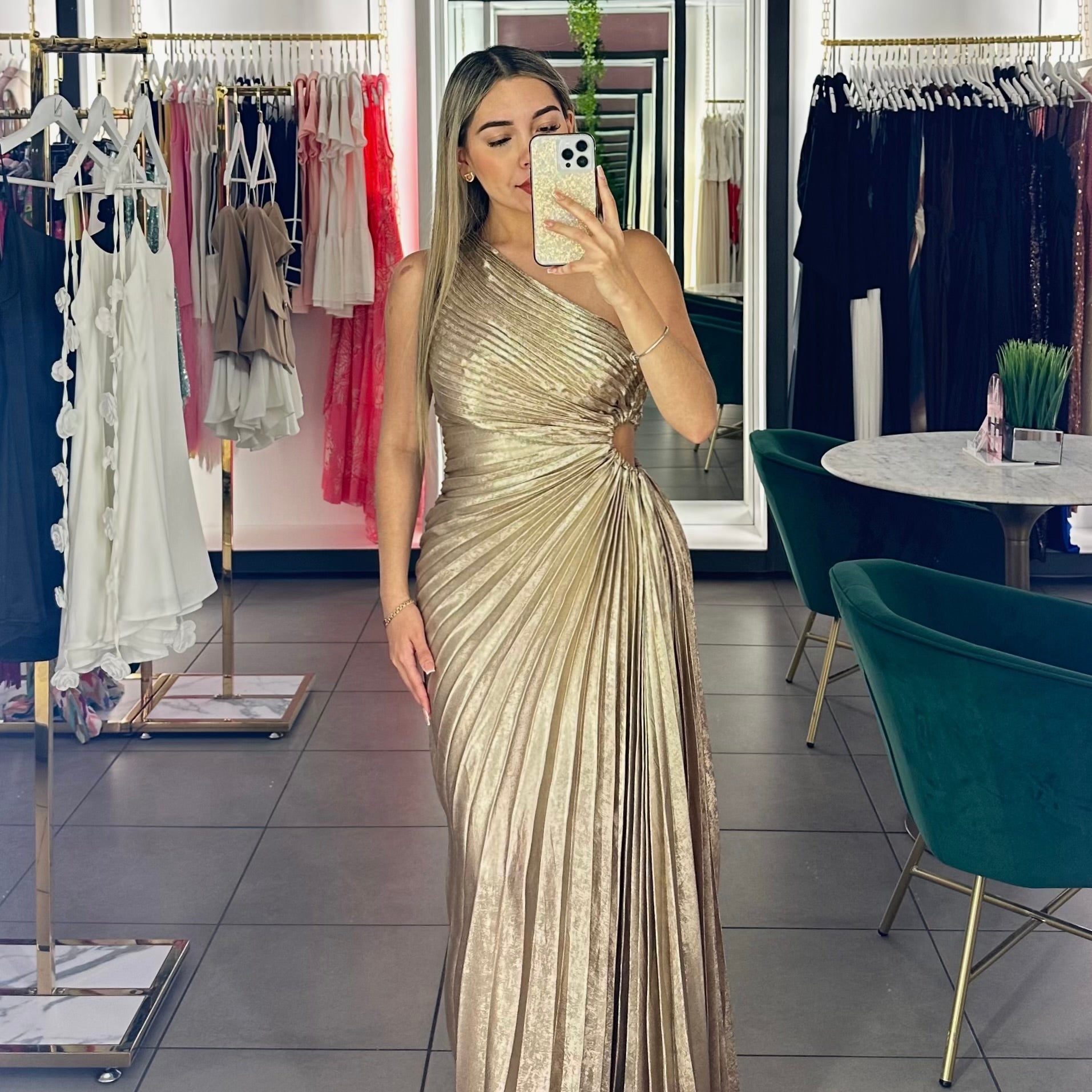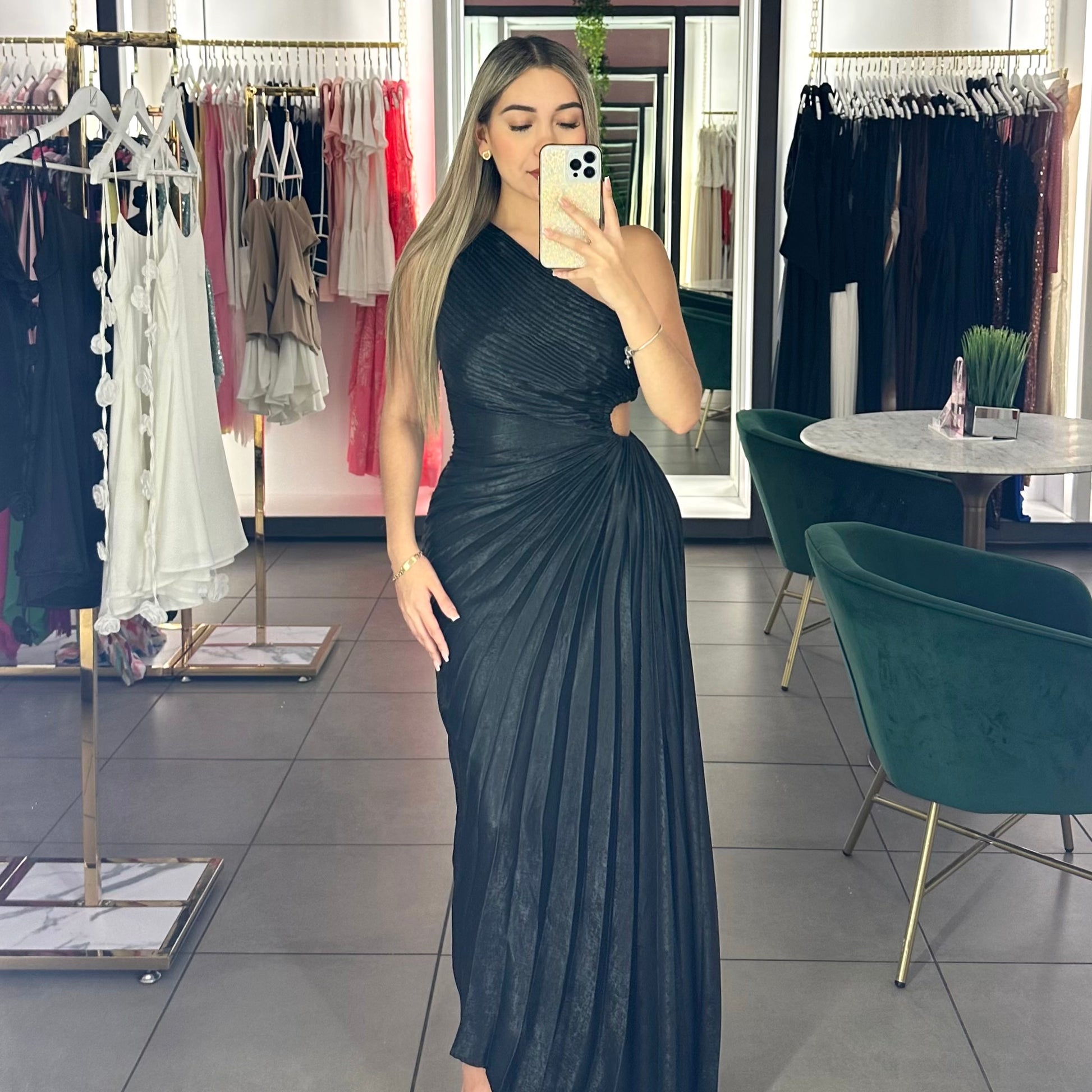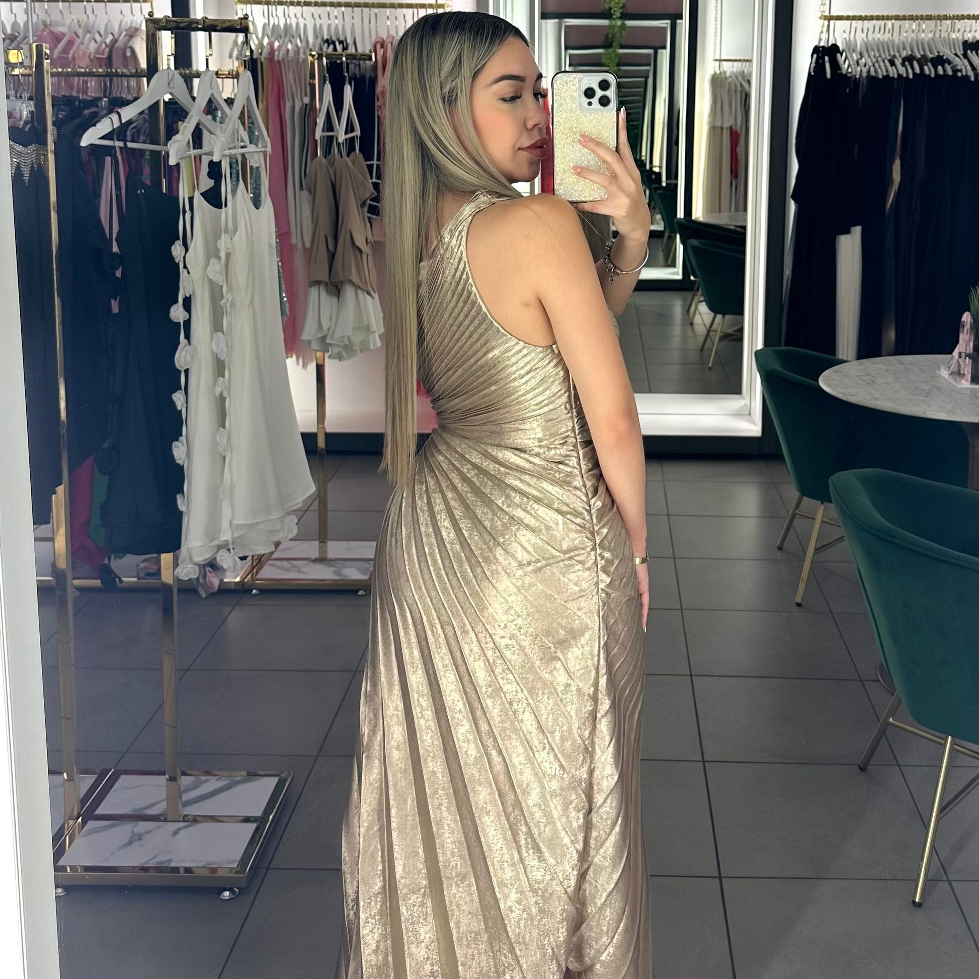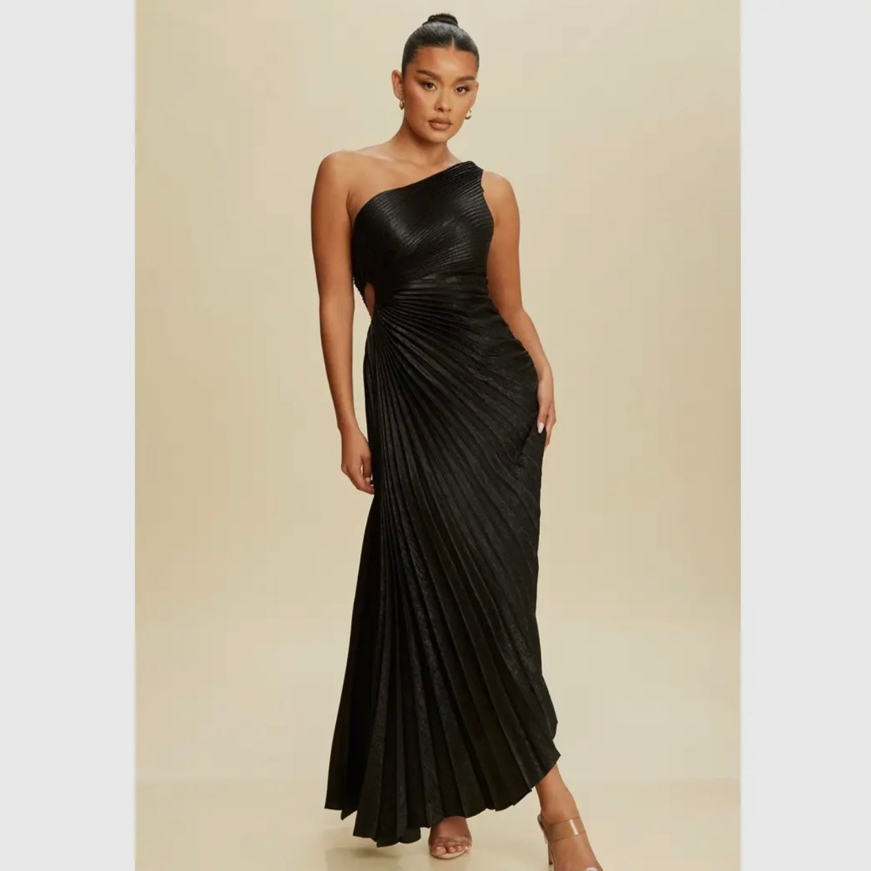 Turn heads in this elegant one-shoulder gown featuring shimmering metallic fabric and sculpted pleats that flatter the waist and flow beautifully. Perfect for weddings, galas, and special occasions.