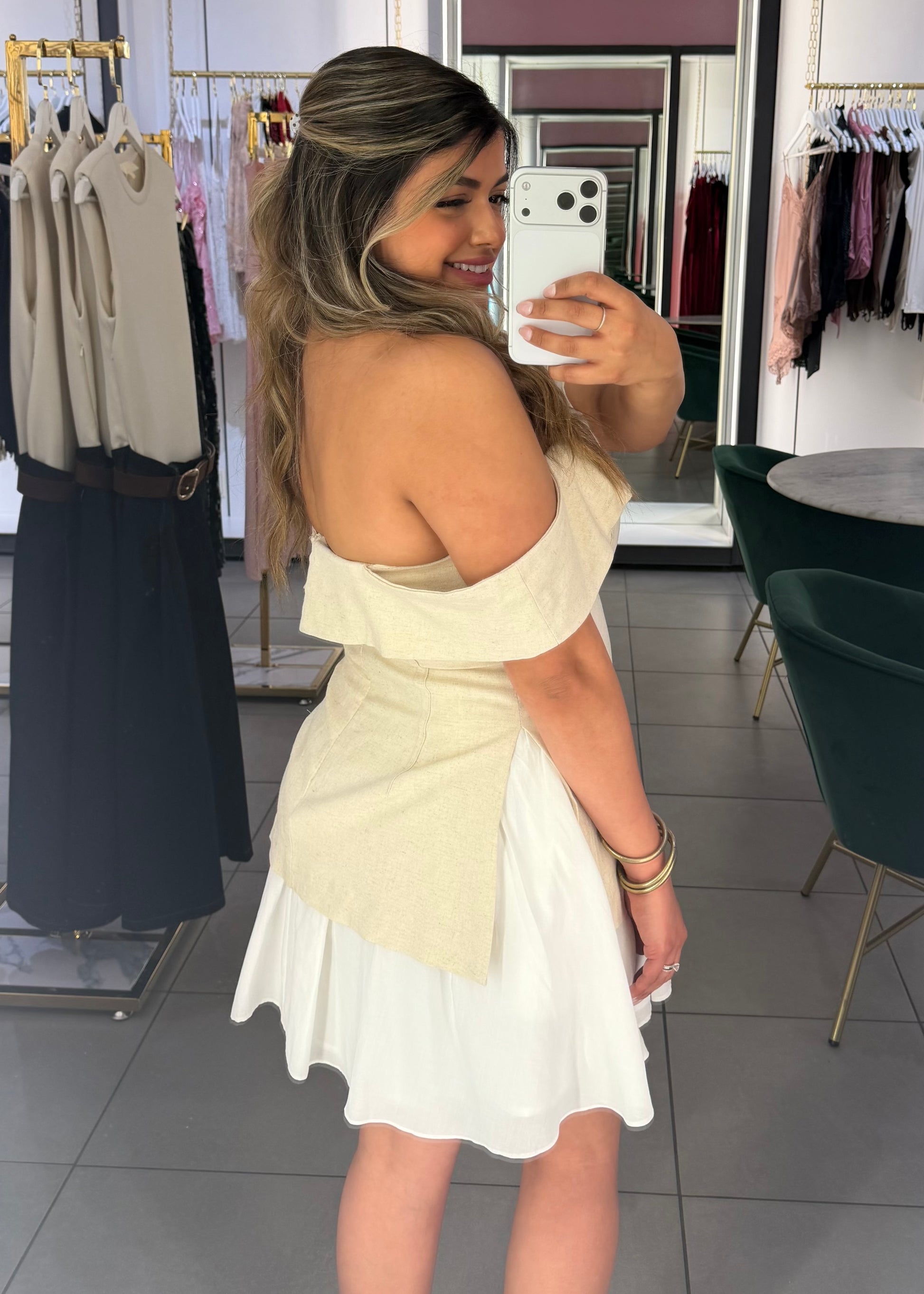 Structured meets flirty in this off-shoulder cream mini dress. A fitted linen bodice, open back, and breezy white ruffle skirt make it the go-to for any warm-weather occasion.