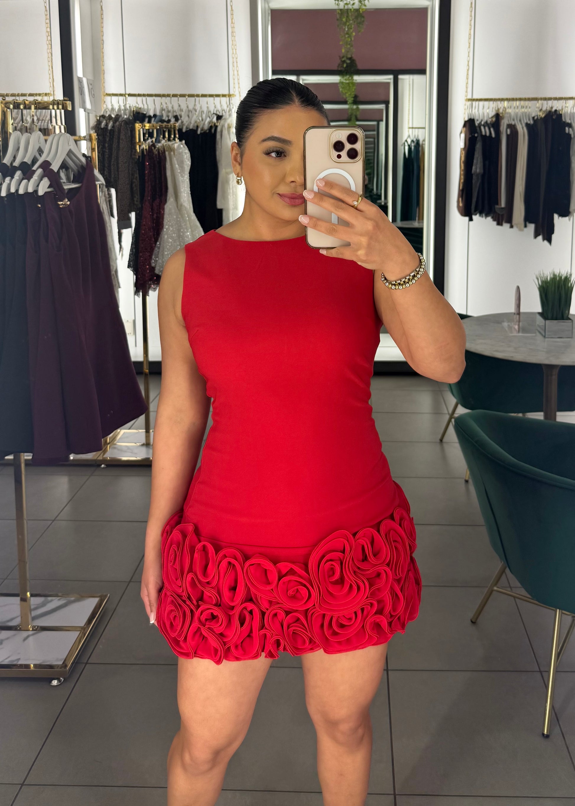 Bloom with confidence in our Red Rose Bloom Mini Dress. This sleek, form-fitting mini features a smooth sleeveless bodice paired with a stunning 3D rose petal skirt for a bold, festive statement. Perfect for holiday parties, special events, and unforgettable nights out.