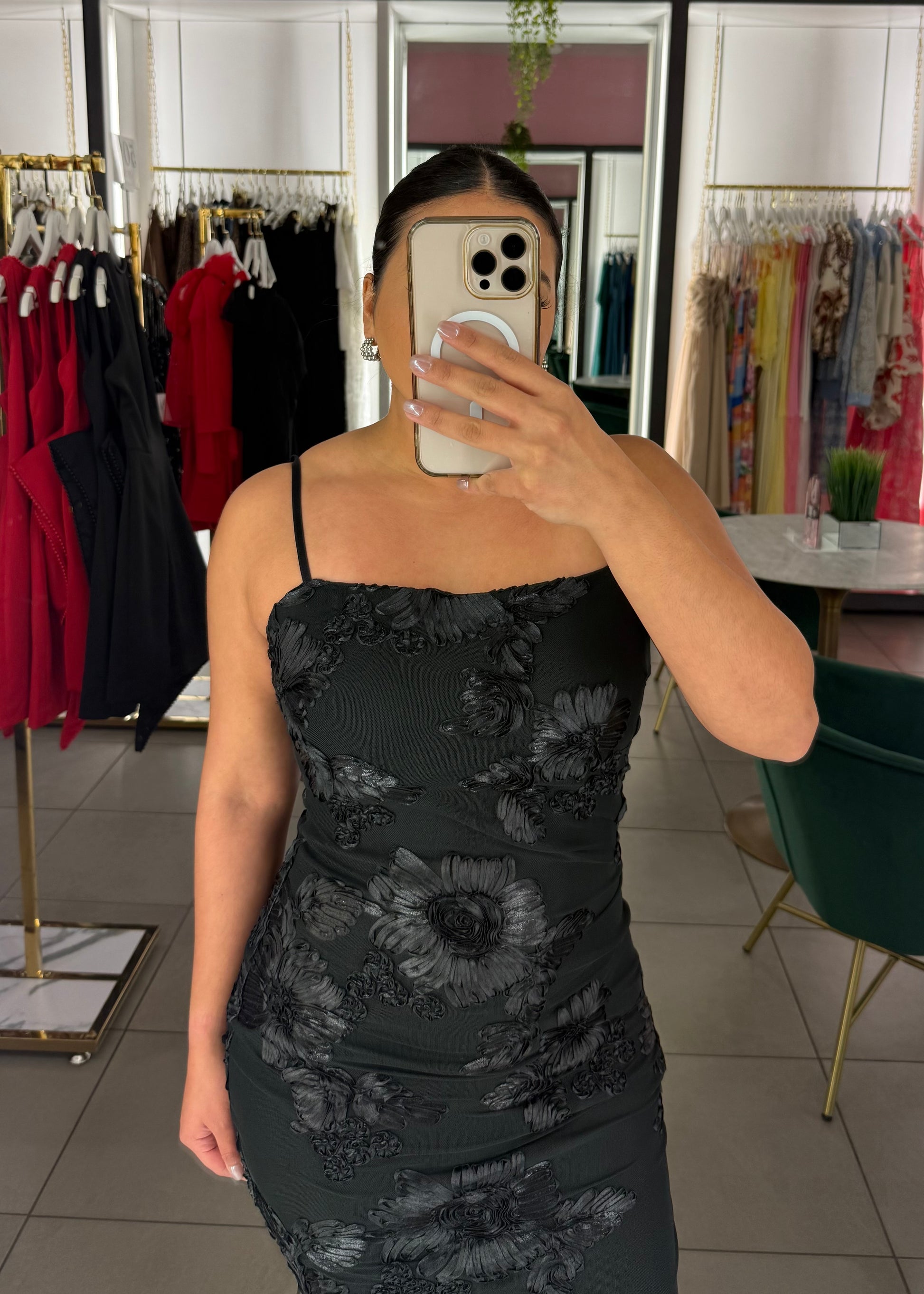 Adjustable spaghetti straps, floral embossed mesh overlay, body hugging fit, back slit for easy movement.